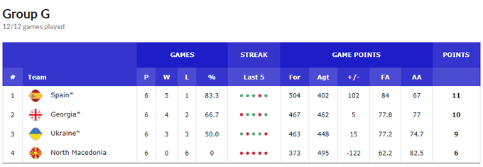 Испания, Грузия и Украина вышли во второй раунд. К ним присоединится тройка из другой группы (Италия, Исландия, Нидерланды). Эти 6 команд разыграют три путевки в финальный раунд ЧМ-2023.