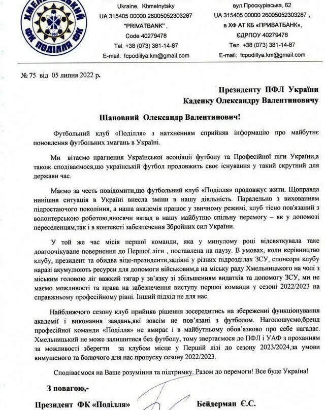 Письмо руководства Подолья в адрес ПФЛ