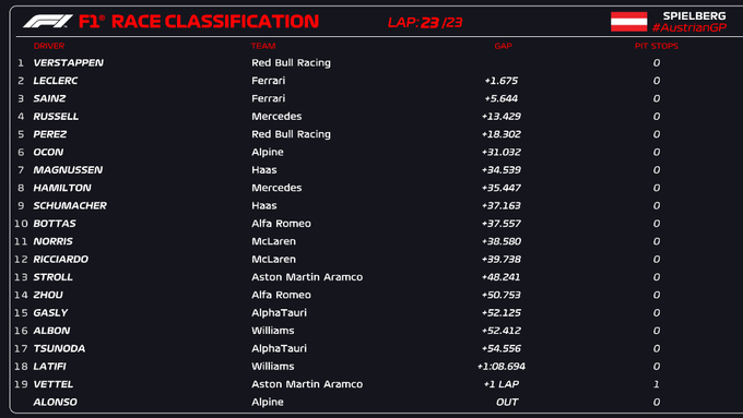 Победу в спринте одержал пилот Ред Булла Макс Ферстаппен, который уверенно лидировал со старта и до финиша. Топ-3 замкнули пилоты Феррари.