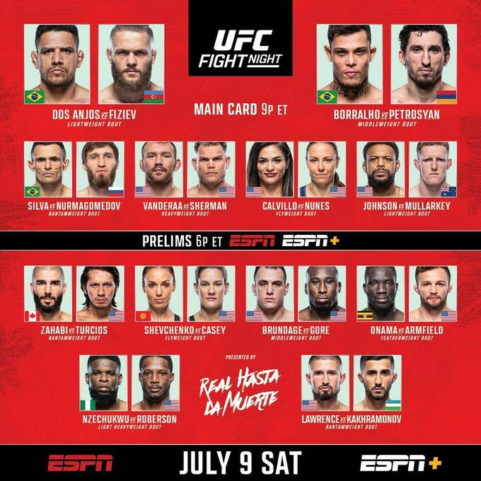 В ночь с 9 на 10 июля в Энтерпрайзе (штат Невада, США) проходит турнир по смешанным единоборствам UFC on ESPN 39.