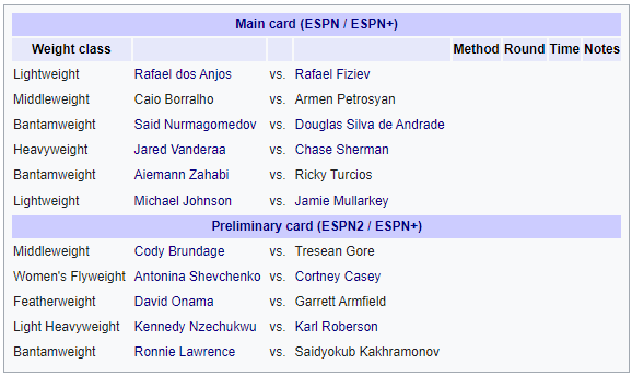 Предварительные бои стартуют в 01:00, основной кард запланирован на 04:00, а главный бой турнира начнется около 06:00 по киевскому времени. В прямом эфире турнир покажут ESPN и UFC TV. В Украине бои можно посмотреть на Setanta Sports. Все новости о турнире будут доступны оперативно на Sport.ua.