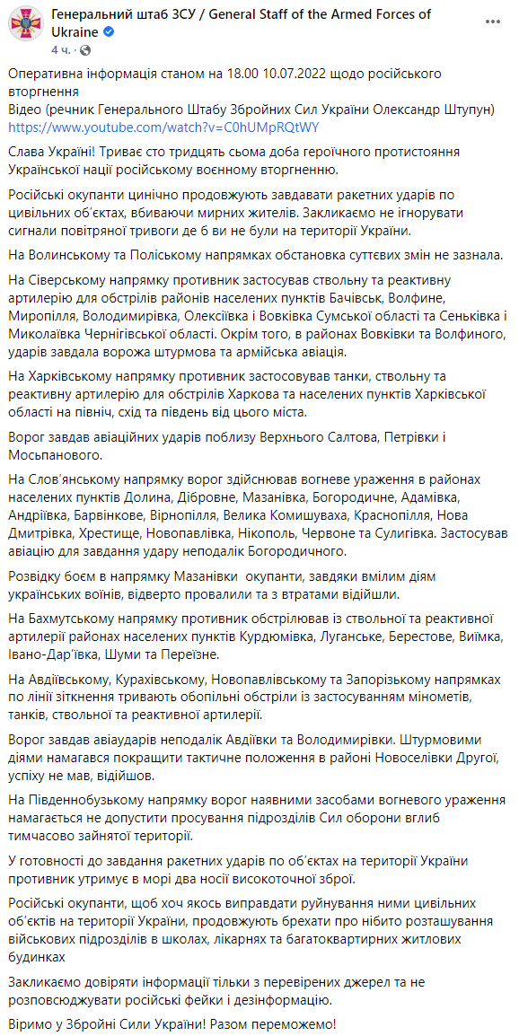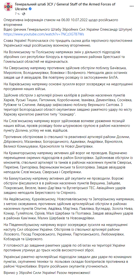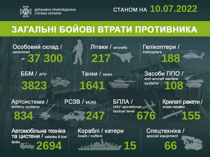 Данные Генштаба: Общие боевые потери противника с 24.02 по 10.07 ориентировочно составили: