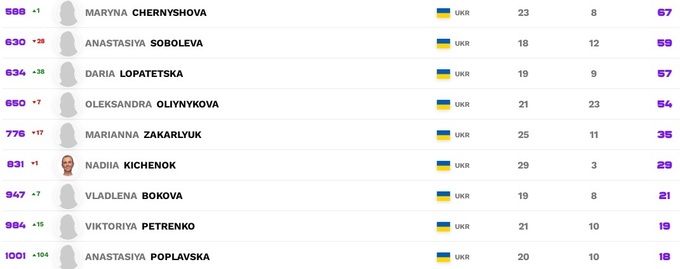Что касается украинок, то Ангелина Калинина потеряла пять позиций, а Даяна Ястремская – восемь. Марта Костюк, Леся Цуренко, Дарья Снигур и Катерина Байндл немного подтянулись. Снигур еще и обновила личное достижение. Все очень плохо у Катарины Завацкой, она уже в конце третьей сотни.