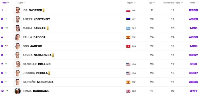 В первой десятке произошло насколько перестановок. Онс Жабер упала со второго места на пятое, что позволило Анетт Контавейт и Марии Саккари повторить свои лучшие достижениия в карьере. Каролина Плишкова вылетела из первой десятки, это помогло Эмме Радукану дебютировать в топ-10, а Даниэль Коллинс, Кори Гауфф и Лейле Фернандес обновить личные рекорды.