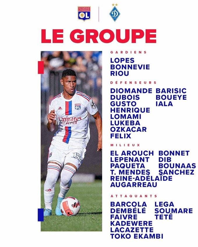 Французский «Лион» обнародовал заявку на два товарищеских матча против киевского «Динамо».
