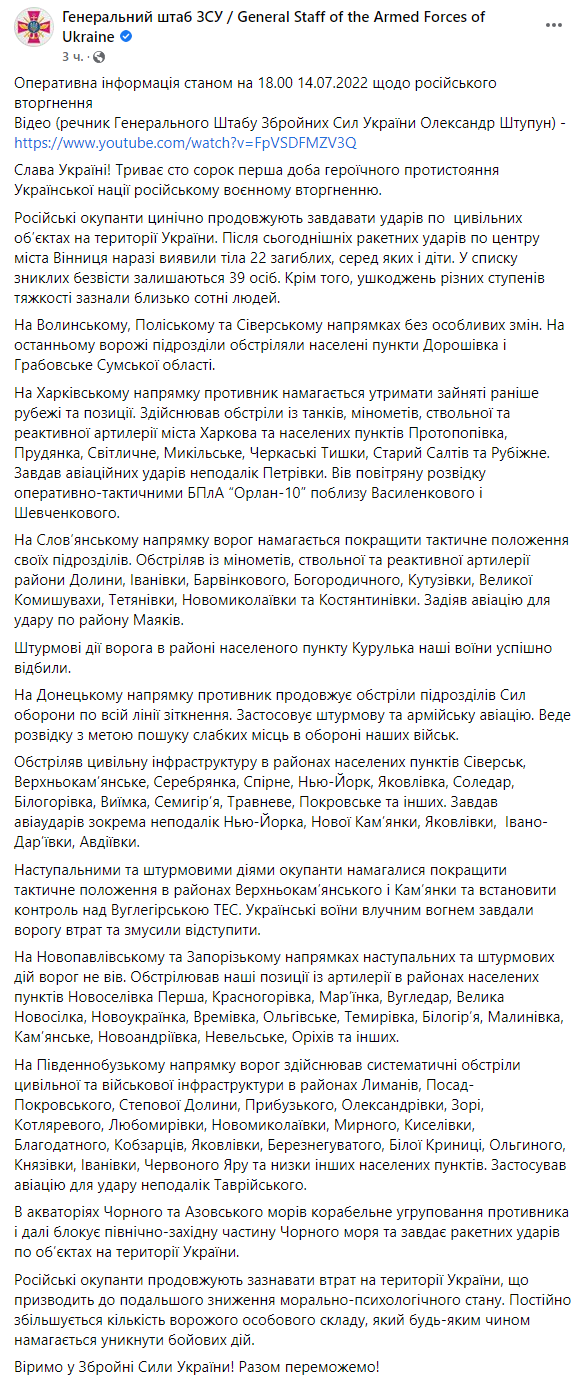 В результате ракетных ударов орков по Виннице в четверг, 14 июля, по состоянию на 17 часов обнаружены тела 22 погибших, только 6 из них удалось опознать, пропавшими без вести числятся 39 человек.
