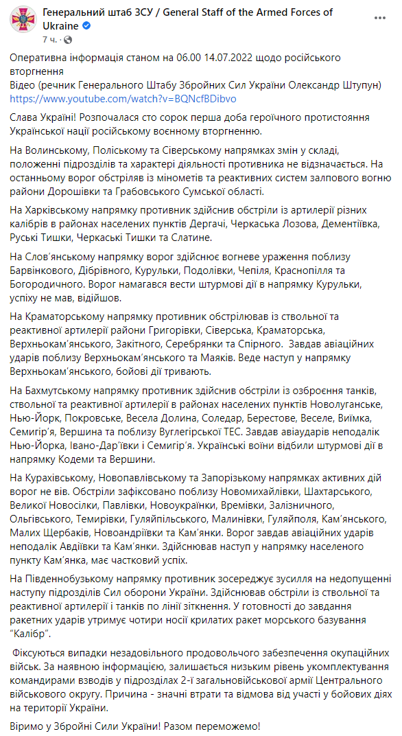 Генеральный штаб ВСУ: Общие боевые потери противника с 24.02 по 14.07 ориентировочно составили: