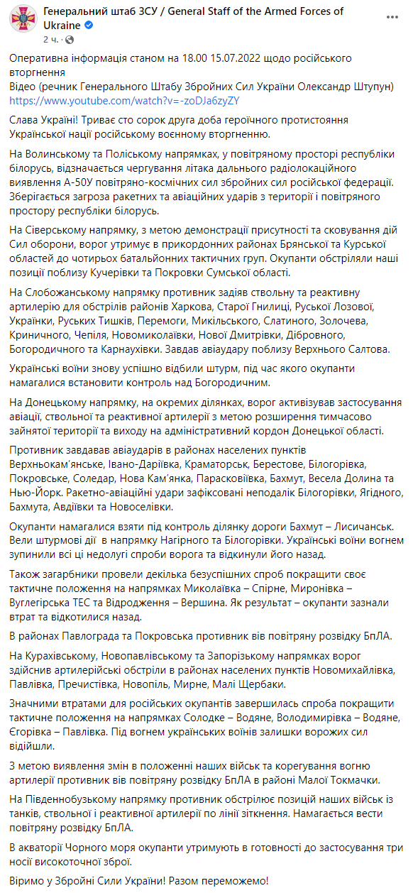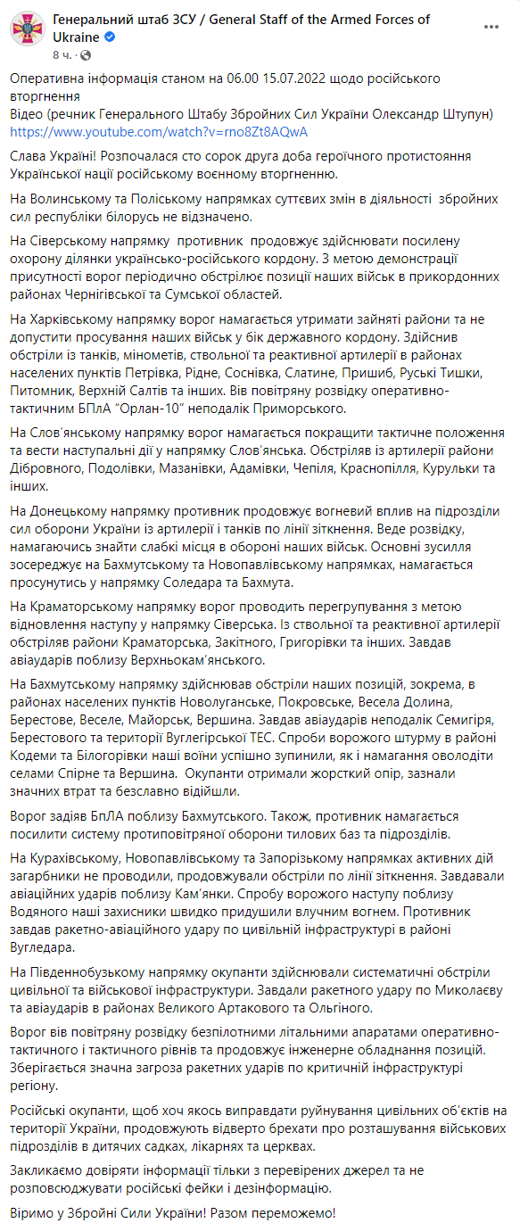 Генштаб ВСУ: Наибольшие потери противник понес на Краматорском направлении. Общие боевые потери российских войск с 24.02 по 15.07 ориентировочно составили: