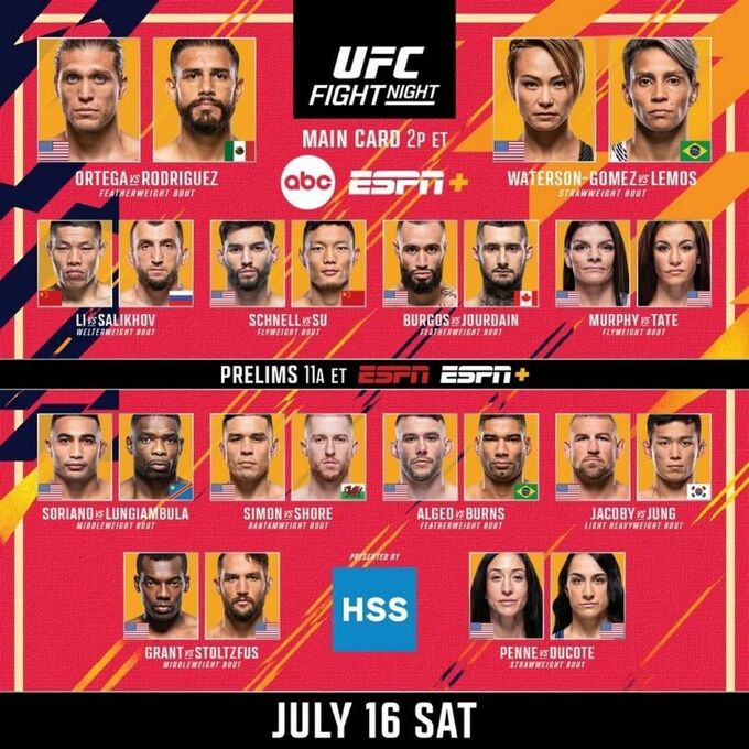 Предварительные бои стартуют в 01:00, основной кард запланирован на 18:00, а главный бой турнира начнется около 23:30 по киевскому времени. В прямом эфире турнир покажут ESPN и UFC TV. В Украине бои можно посмотреть на Setanta Sports. Все новости о турнире будут доступны оперативно на Sport.ua.