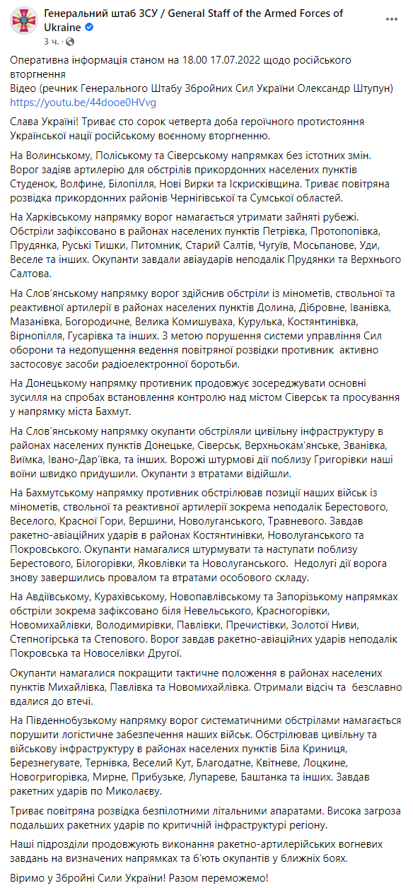 07:10. Сводка Генштаба: На Славянском направлении враг понес потери и отступил