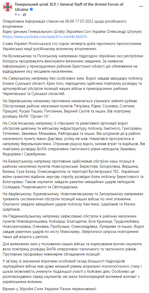Данные Генштаба ВСУ: Общие боевые потери противника с 24.02 по 17.07 ориентировочно составили: