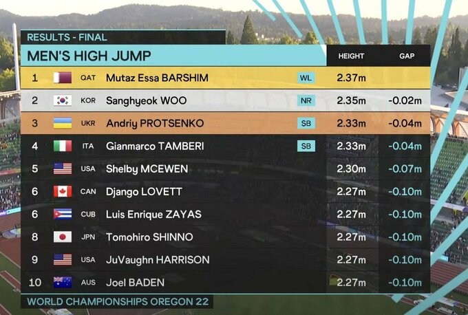 Украинский прыгун в высоту Андрей Проценко завоевал бронзовую медаль на чемпионате мира, который проходит в американском Юджине.