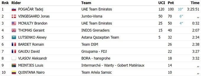 Словенский велогонщик команды «UAE Emirates» Тадей Погачар стал победителем 17-го этапа Тур де Франс-2022. Это его третья победа на нынешнем Туре. Лидер общего зачета Йонас Вингегор сумел отбить все атаки Погачара и финишировал вторым.