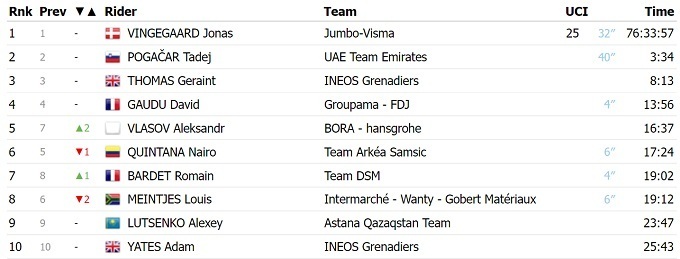 Его партнер по команде, Йонас Вингегор, финишировал сегодня вторым и фактически обеспечил себе победу в общем зачете. Завтра гонщиков ждет заключительный «этап дружбы» в Париже.