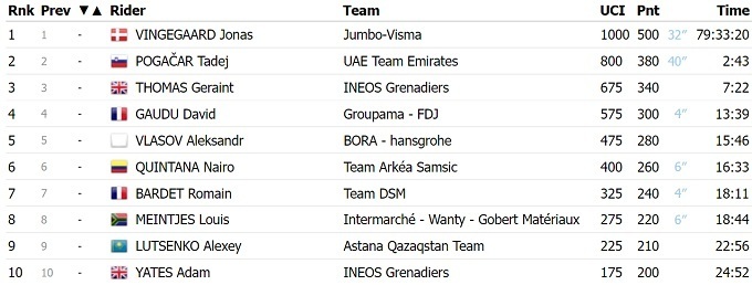 Победу в общем зачете одержал датчанин Йонас Вингегор из «Jumbo Visma». Вторым стал победитель двух предыдущих Туров, Тадей Погачар.