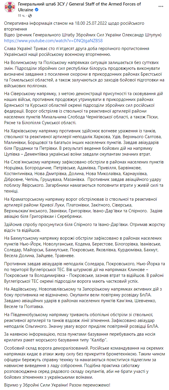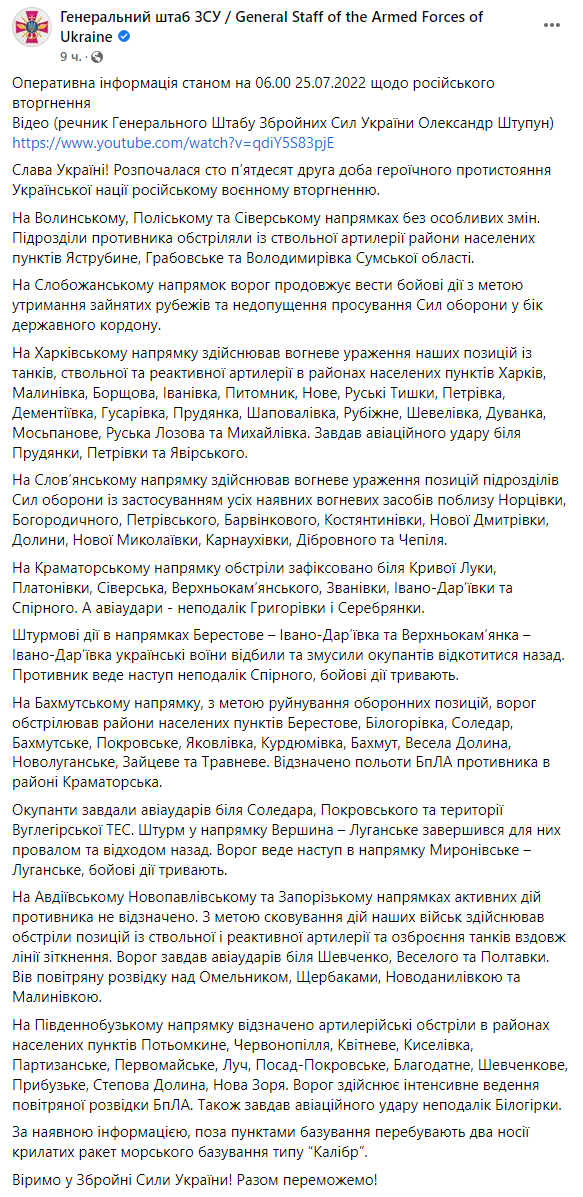 24 июля российские войска совершили ограниченные наземные атаки к северо-западу от Славянска, к востоку от Северска и к югу от Бахмута, ограничены наземные атаки на Херсонщине. Кроме того, ISW пишет, что за последнюю неделю ВСУ повредили все три контролируемые россией моста, ведущие в Херсон.