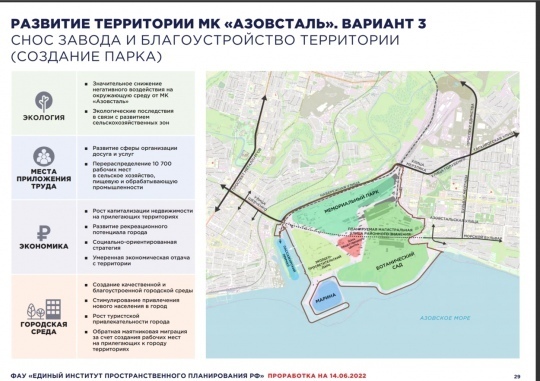 Относительно Азовстали, в концепции расписаны четыре варианта – возобновление производства, создание какой-то общественно-деловой площадки и два сценария строительства парка. Главарь так называемой ДНР Денис Пушилин заявил, что на месте завода Азовсталь хотят сделать технопарк или просто парковую зону.