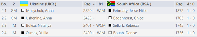 Женская сборная Украины обыграла команду ЮАР (4:0). Свои партии выиграли Анна Музычук, Анна Ушенина, Наталья Букса, Юлия Осьмак. Во втором туре женская украинская команда сыграет против сборной Турции.