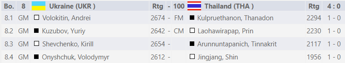Мужская сборная Украины обыграла команду Таиланда (4:0). Победы одержали Андрей Волокитин, Юрий Кузубов, Кирилл Шевченко, Владимир Онищук. Во втором туре мужская сборная Украины сыграет против команды Албании.