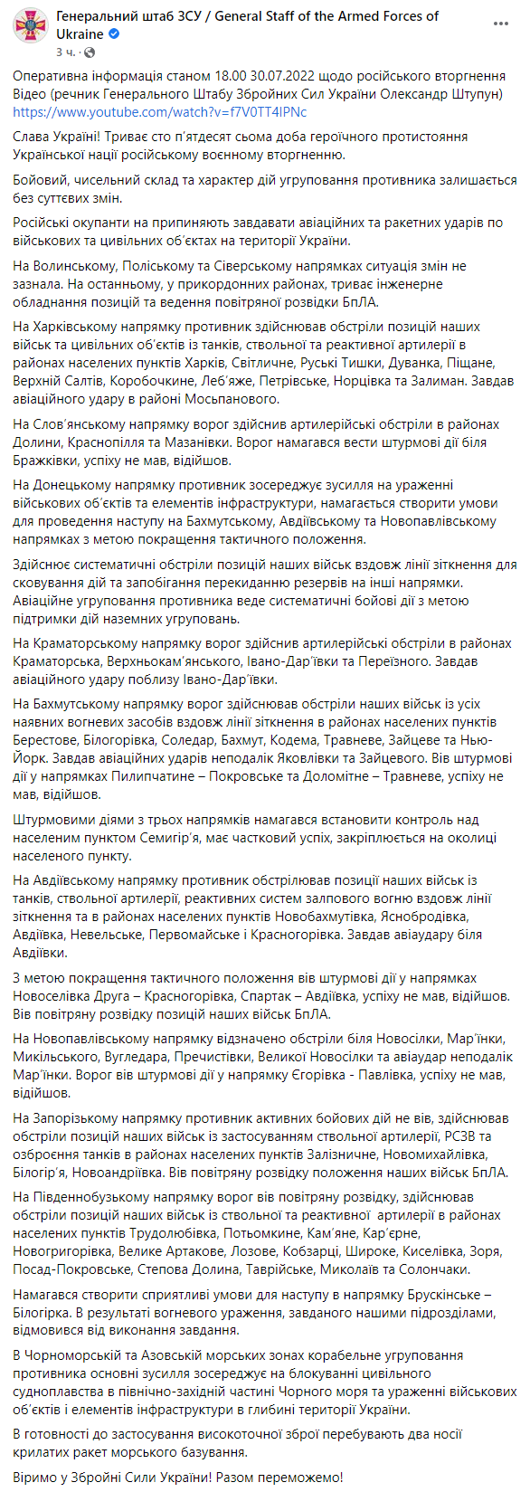 Оперативное командование Юг: «С обнаружением подготовки противника к проведению контратаки в направлении Брускинское – Билозирка нашими силами нанесено огневое поражение. Противник отказался от выполнения задания.