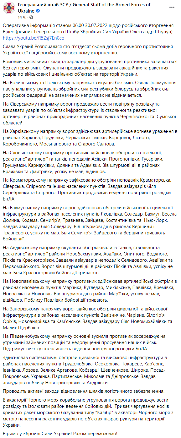 Общие потери врага составляют: 105 захватчиков, 7 танков Т-62 и 72, гаубица Мста-Б и 2 самоходные артустановки, самоходная артиллерийско-минометная установка Нона-С, 17 единиц бронированной и автомобильной техники, также уничтожены 2 полевых склада боеприпасов в Бериславском и Херсонском районах».