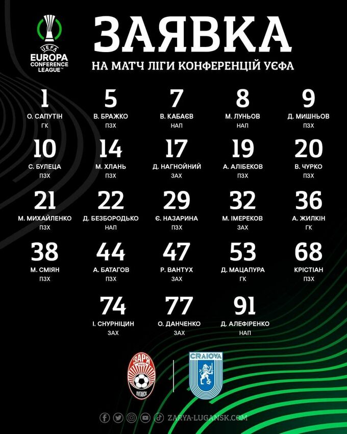 ФОТО. Заря обнародовала заявку на Лигу конференций