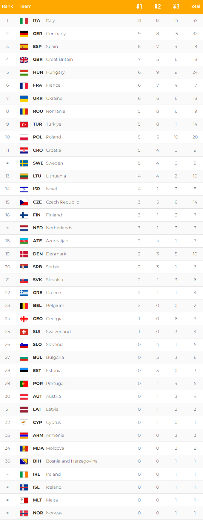 По итогам всех соревнований у сине-желтых в активе 18 медалей (6 золотых, 6 серебряных, 6 бронзовых), и это итоговое 7-е место в медальном зачете ЕЮОФ.