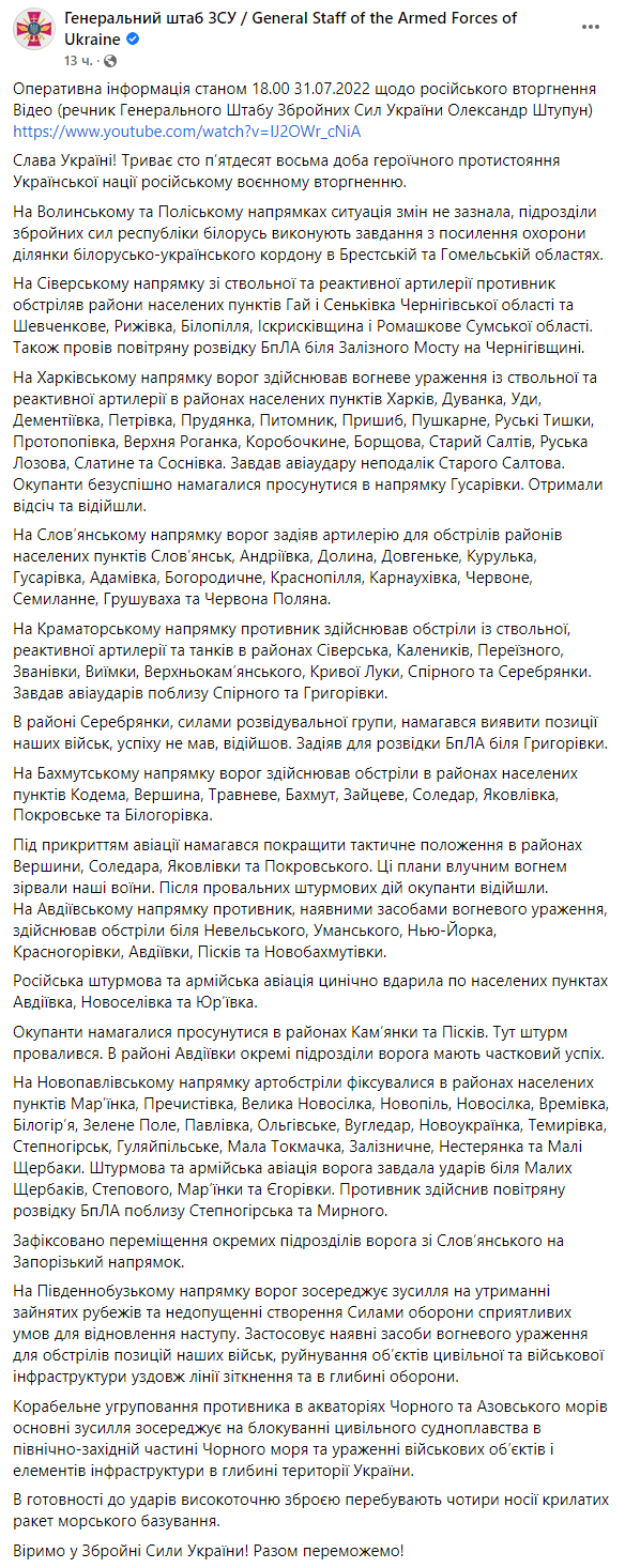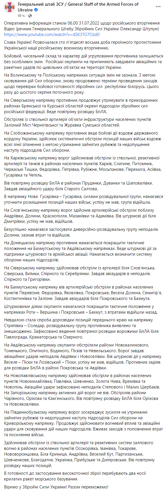 По данным разведки, после ударов ВСУ в ночь на 29 июля по местонахождению сил оккупантов вблизи поселков Верхний Токмак и Черниговка Запорожской области, россияне отвели личный состав и технику на другие позиции. Около 40 раненых были доставлены в госпиталь города Пологи. Из Черниговки подразделения выведены практически в полном составе.