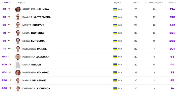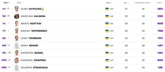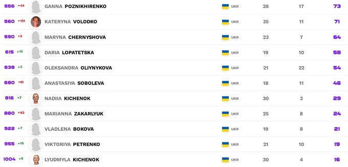 Что касается украинок, то Катерина Байндл совершила грандиозный рывок на 56 позиций, компенсировав недавнее падение в рейтинге. У всех остальных совсем небольшие изменения или их отсутствие, хотя Катерина Володько (Бондаренко) опустилась уже в шестую сотню.