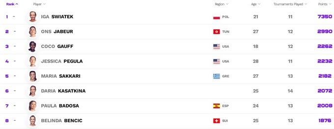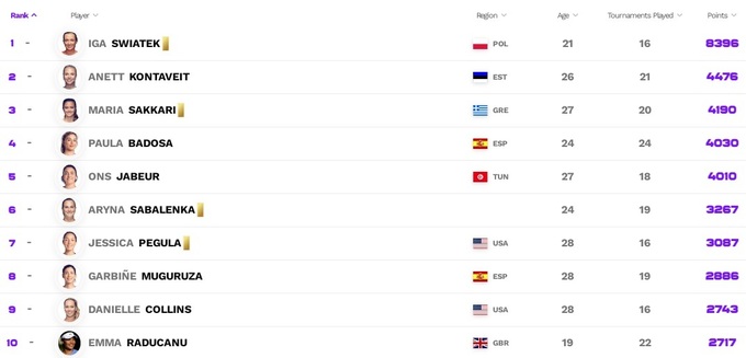 В Чемпионской гонке WTA без изменений среди лидеров сезона.