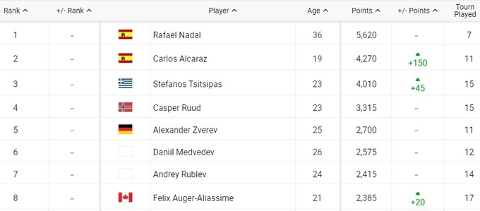 В Чемпионской гонке среди лучших теннисистов сезона на этот раз без изменений. Синнер поднялся на 13-е место, Баутиста Агут – на 16-е, де Минаур – на 18-е.