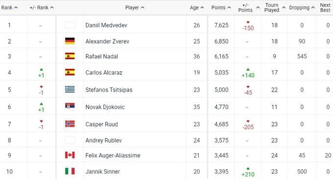 В первой десятке состоялось еще одно изменение – Новак Джокович обошел Каспера Рууда.