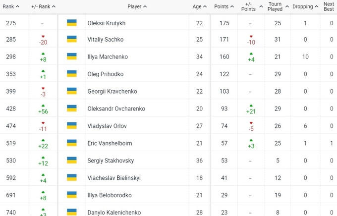 Что касается украинцев, то Виталий Сачко потерял статус первой ракетки нашей стран. Лидером вновь стал Алексей Крутых. Илья Марченко вернулся в третью сотню, солидно добавил Александр Овчаренко. Также продолжает прогрессировать Эрик Ваншельбойм.