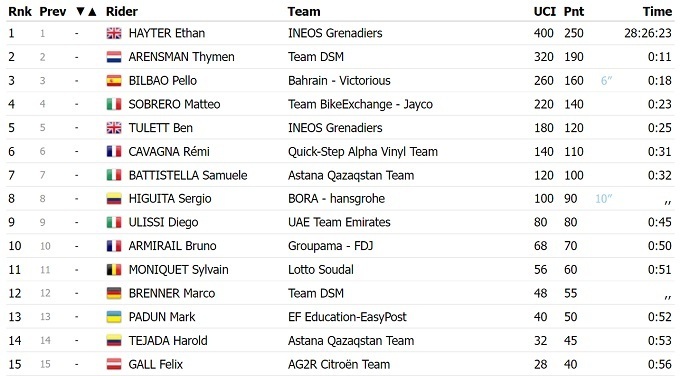 Победу в общем зачете одержал британец Итан Хейтер из команды «Ineos Grenadiers». 13-е место в генеральной классификации занял украинец Марк Падун из «Education First», который вчера замкнул топ-10 на шестом этапе.