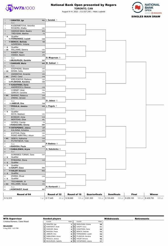 WTA. Сетка турнира в Торонто (Канада)