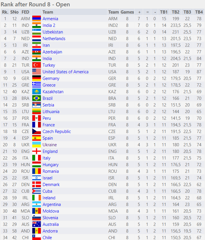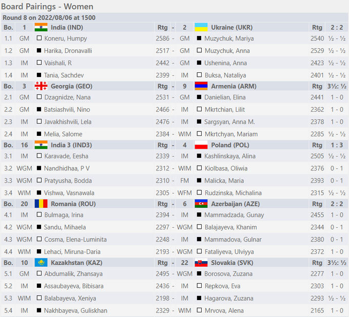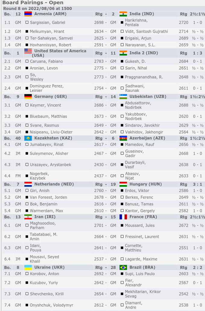 6 августа в индийском Ченнае состоялись матчи 8-го тура шахматной Олимпиады 2022.