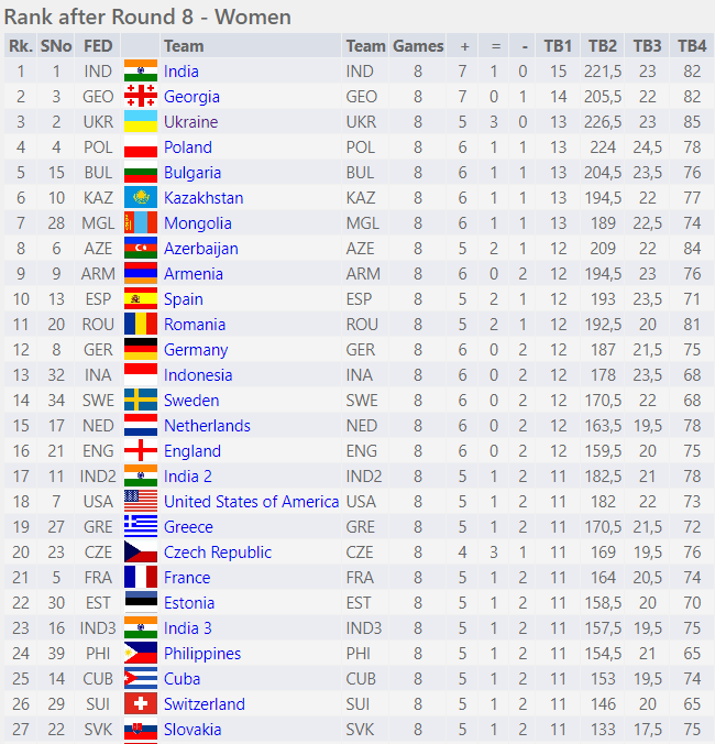 Женская сборная Украины встречалась с лидером, Индией, и была зафиксирована ничья (2:2). На всех досках украинки подписали бланки с мирным результатом: Мария Музычук, Анна Музычук, Анна Ушенина, Наталья Букса. Женская украинская команда входит в топ-3 с 13 очками из 16 возможных и в 9-м туре сыграет против сборной Грузии.