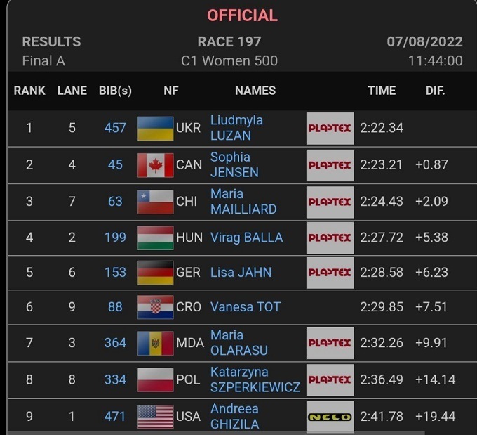 Украинка Людмила Лузан завоевала свое второе золото на ЧМ-2022 по гребле, который проходит в Канаде. Она победила в гребле на каноэ-одиночке на дистанции 500 метров.