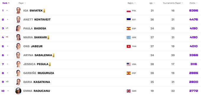 В первой десятке состоялось еще одно небольшое изменение – Паула Бадоса опередила Марию Саккари и вернулась в топ-3.