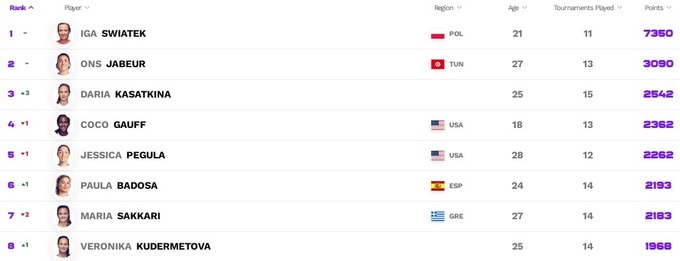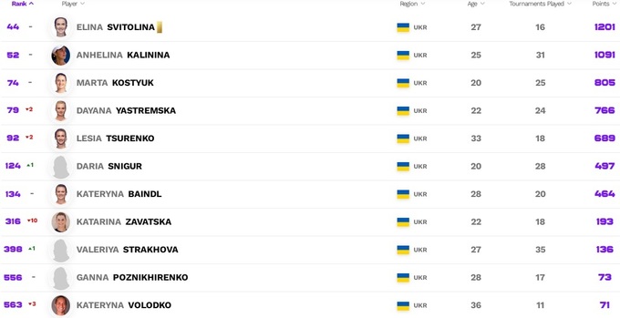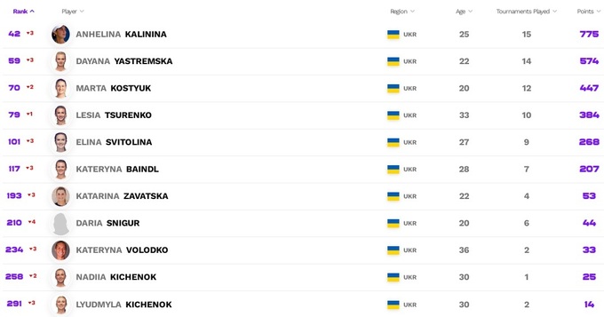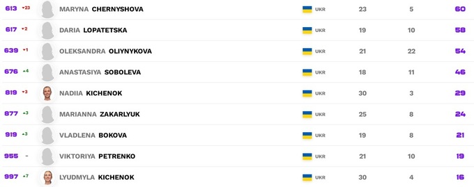 Что касается украинок, то мало что изменилось. Ангелина Калинина и Марта Костюк сохранили свои позиции. Даяна Ястремская и Леся Цуренко немного потеряли, а Дарья Снигур добавила одну строчку, показав лучшее достижение в карьере.