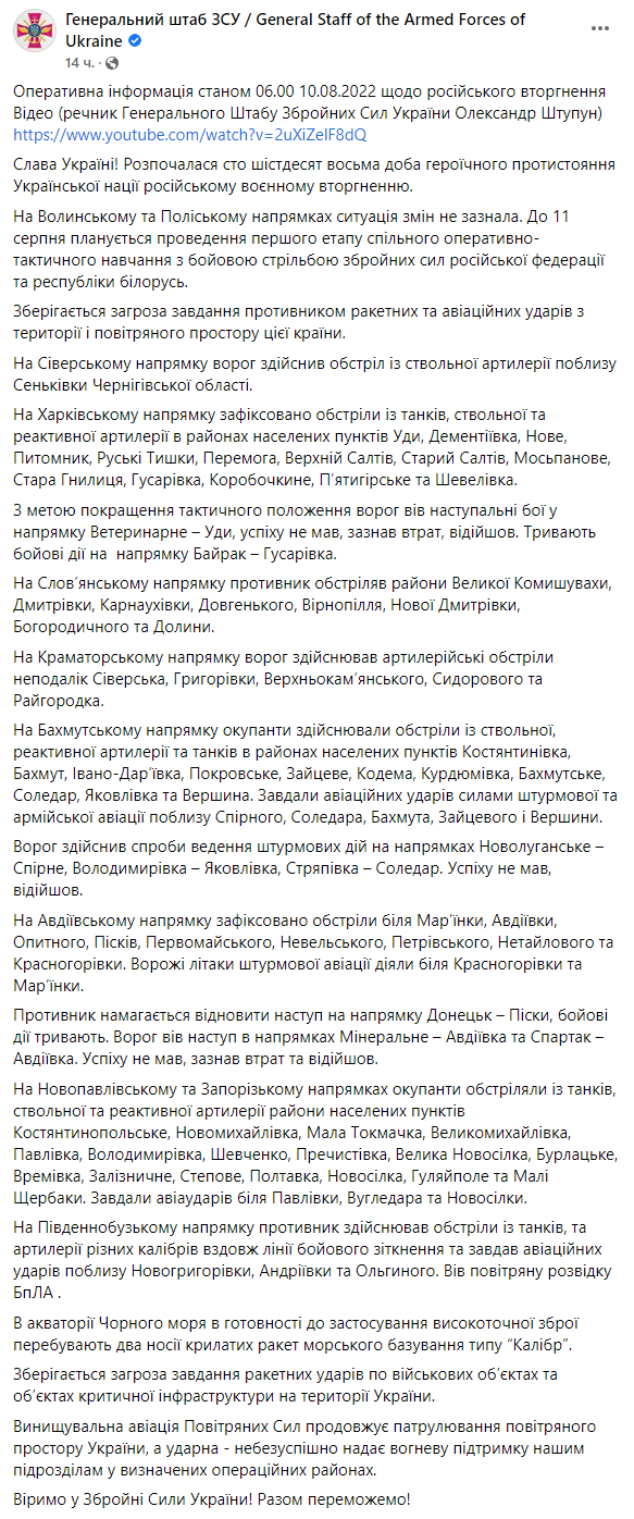 Данные Генштаба ВСУ: Наибольшие потери противник понес на Донецком направлении. Общие боевые потери противника с 24.02 по 10.08 ориентировочно составили: