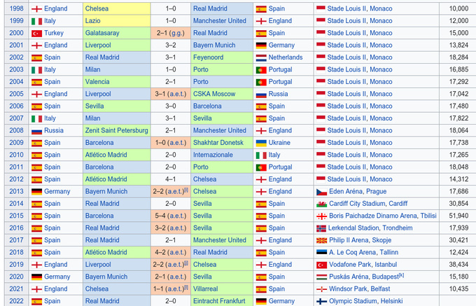 Матчи за Суперкубок УЕФА (из одного матча с 1998 года)