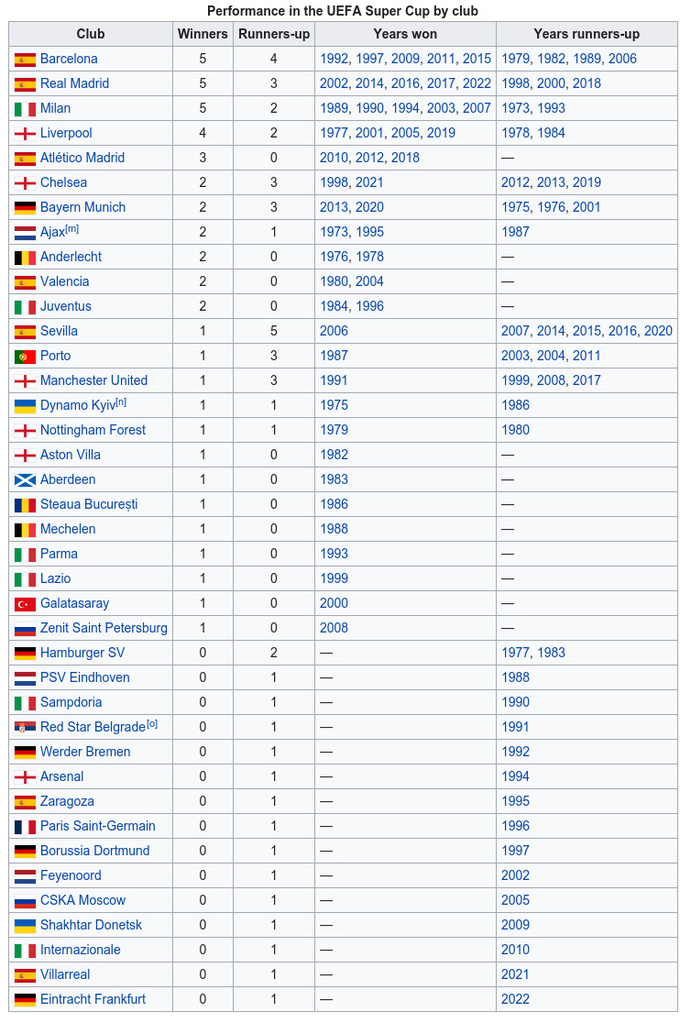 Все обладатели Суперкубка УЕФА