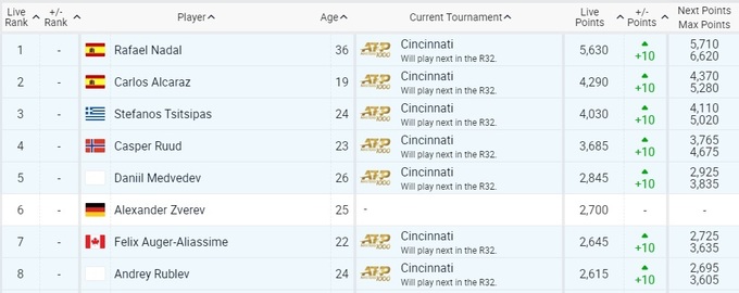 В первой десятки состоялось одно изменение – Каспер Рууд вернулся в топ-5, а Стефанос Циципас опустился уже на седьмую позицию.