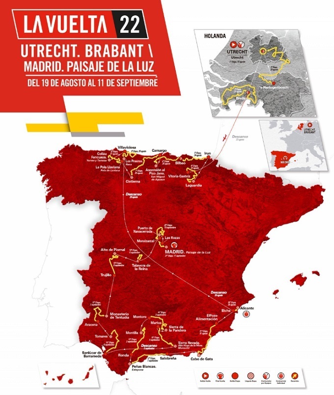 Вуэльта-2022 – это 21 этап суммарной дистанцией 3280 км. Кроме командной разделки на стартовом этапе в Утрехте гонщиков будет ждать еще одна гонка на время – индивидуальная разделка на 10-м этапе, который будет открывать программу второй недели.