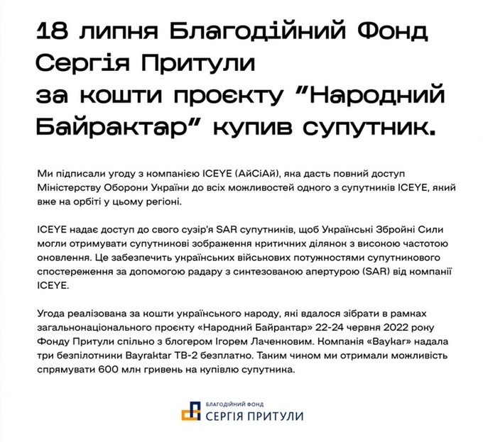 Ранее Фонд Притулы собрал 600 миллионов гривен в рамках проекта Народный Байрактар, однако фирма Байкар решила предоставить беспилотники бесплатно, поэтому деньги пошли на спутник.