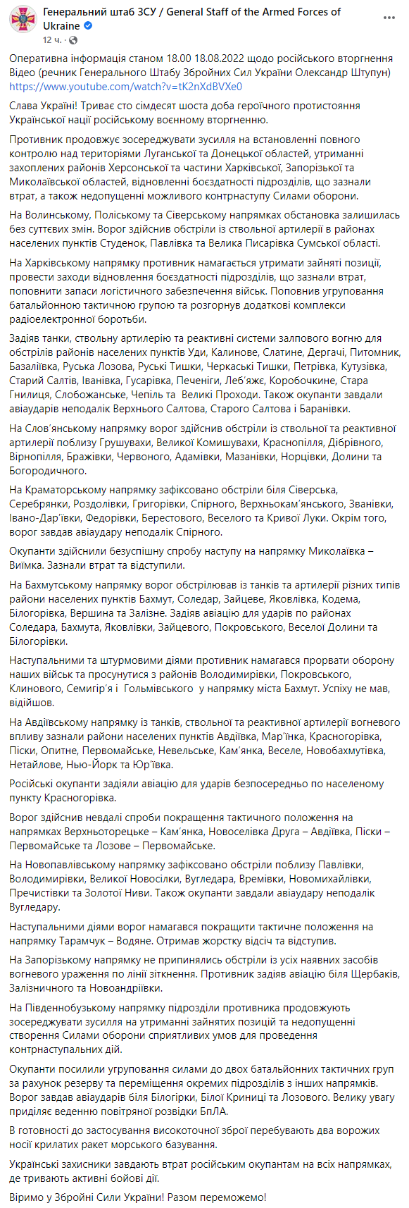 Данные Генштаба ВСУ: Общие боевые потери противника с 24.02 по 18.08 ориентировочно составили: