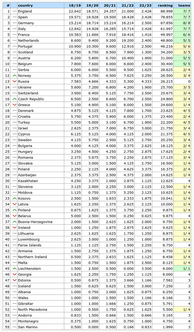 Норвегия прибавила 0.500 балла за неделю, обогнала дисквалифицированную россию и вышла на 12-ю позицию. «Буде-Глимт» выиграл матч квалификации ЛЧ у «Динамо» Загреб (1:0), «Мольде» одержал победу над румынским ФКСБ (2:1) в ЛК, и только «Викинг» проиграл свой поединок – австрийскому «Вольфсбергу» (0:1).