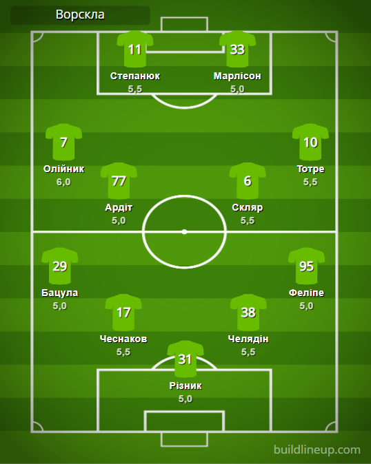 «Ворскла»: Ризнык – Бацула (Мельничук, 68), Чеснаков, Челядин (Яворский, 75), Филипе (Крупский, 83) – Олейник, Ардит, Скляр, Тотре (Козыренко, 68) – Степанюк, Марлисон (Сулейманов, 68).