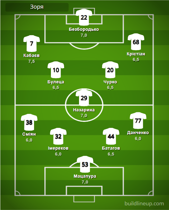 «Заря»: Мацапура – Смиян, Имереков, Батагов, Данченко – Булеца (Мишнев, 63), Назарина (Бражко, 85), Чурко – Кабаев (Вантух, 85), Безбородько (Нагнойный, 63), Кристиан (Русин, 78).